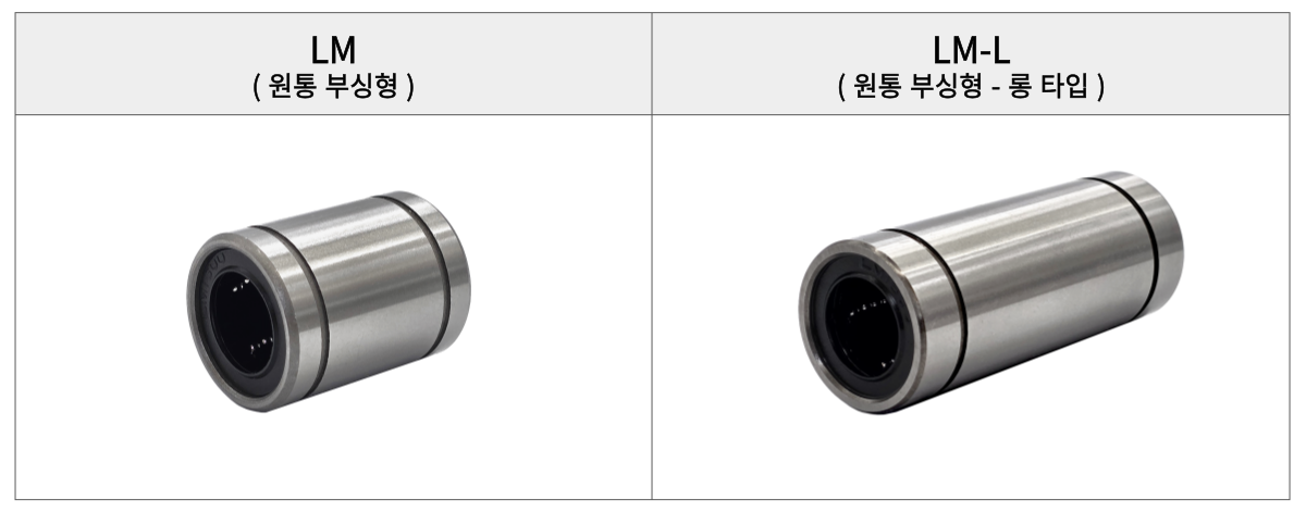 LM 타입은 원통 부싱형 구조로 일반적인 기계 장비에서 가장 보편적으로 사용되는 표준 모델입니다. 원통형 하우징에 바로 장착할 수 있어 교체와 확장이 간편하며, 3D 프린터, 커스텀 XY축, 테스트 지그 등 다양한 장비에 폭넓게 활용할 수 있습니다. |