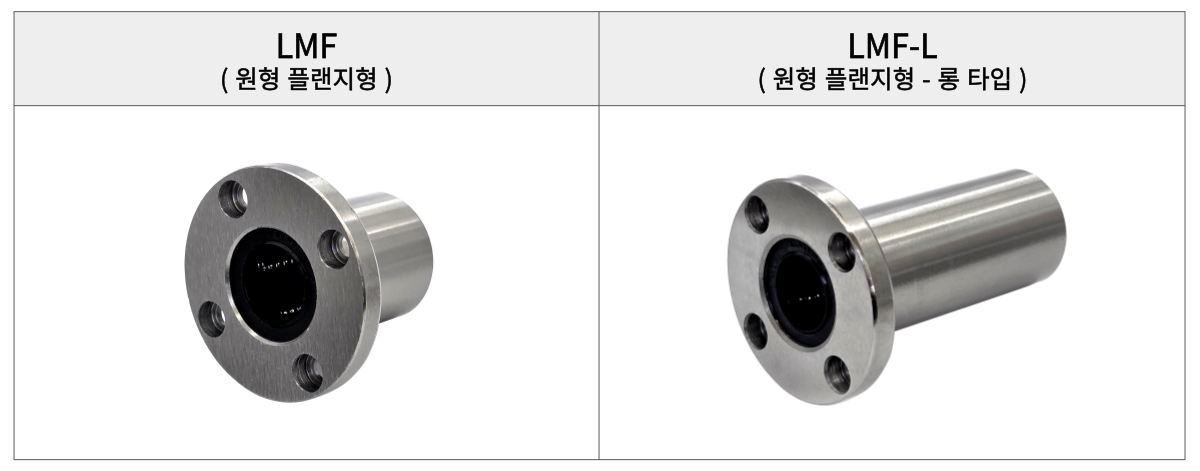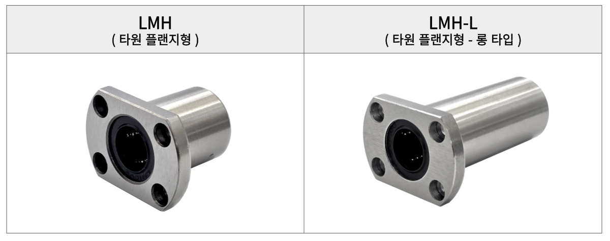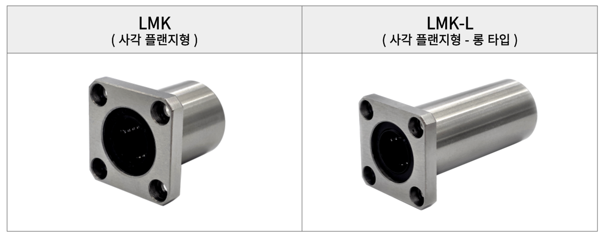 사각 플랜지(LMK)의 균형 잡힌 체결에 롱 바디의 접촉 길이를 더해 흔들림과 비틀림을 한층 억제하는 모델입니다. 반복 하중이 걸리거나 긴 암·오프셋이 있는 환경에서도 안정적인 성능을 제공하며, 작업물 질량이 큰 축이나 내구성이 중요한 자동화 공정과 산업용 장비 등에 적합합니다. |