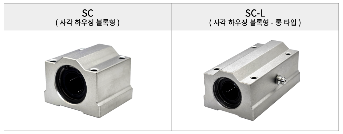 SC형의 롱타입으로, 하우징 길이를 늘려 축 지지 면적과 직선 운동 안정성이 강화된 모델입니다.