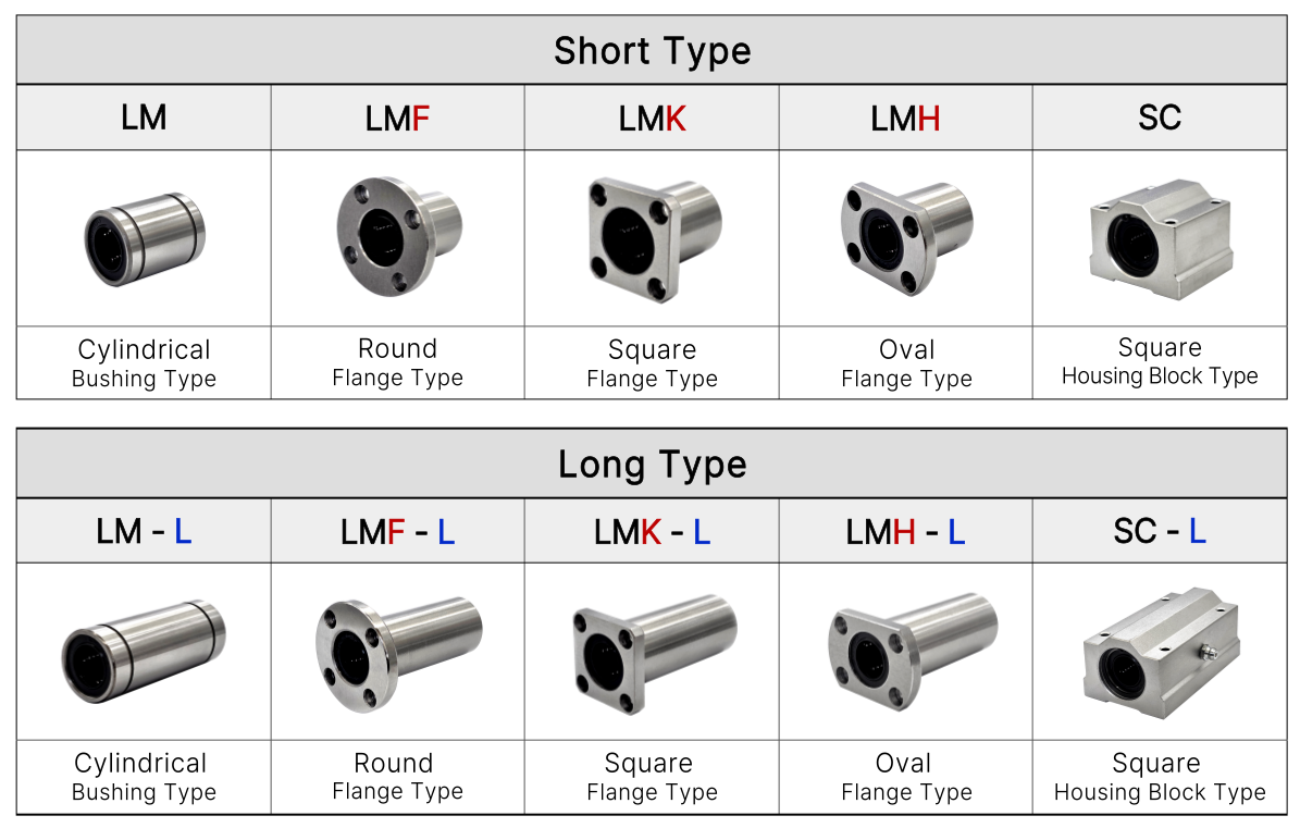 At the SGO online store, we offer a wide range of linear bushings, including the commonly used cylindrical LM type, circular flange type (LMF), square flange type (LMK), oval flange type (LMH), and square housing block type (SC). |