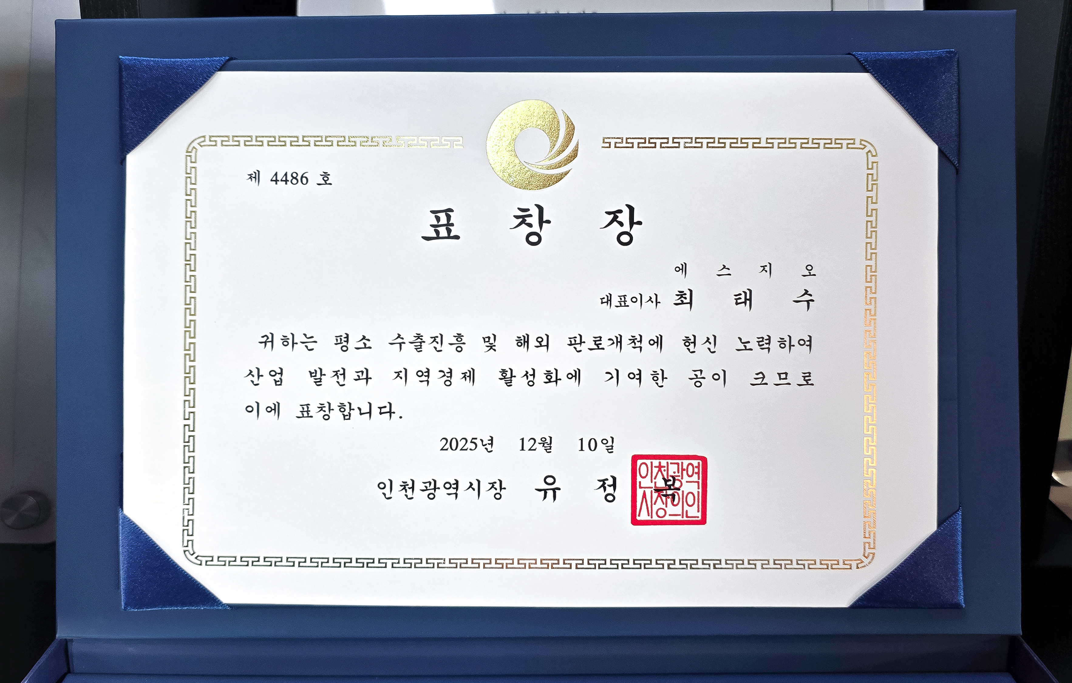 이번 표창은 어려운 대외 여건 속에서도 지속적인 해외시장 개척과 수출 확대를 통해 지역 경제 활성화에 기여한 공로를 인정받아 수여된 것으로, 에스지오의 글로벌 경쟁력과 그간의 노력을 공식적으로 평가받은 의미 있는 성과입니다.