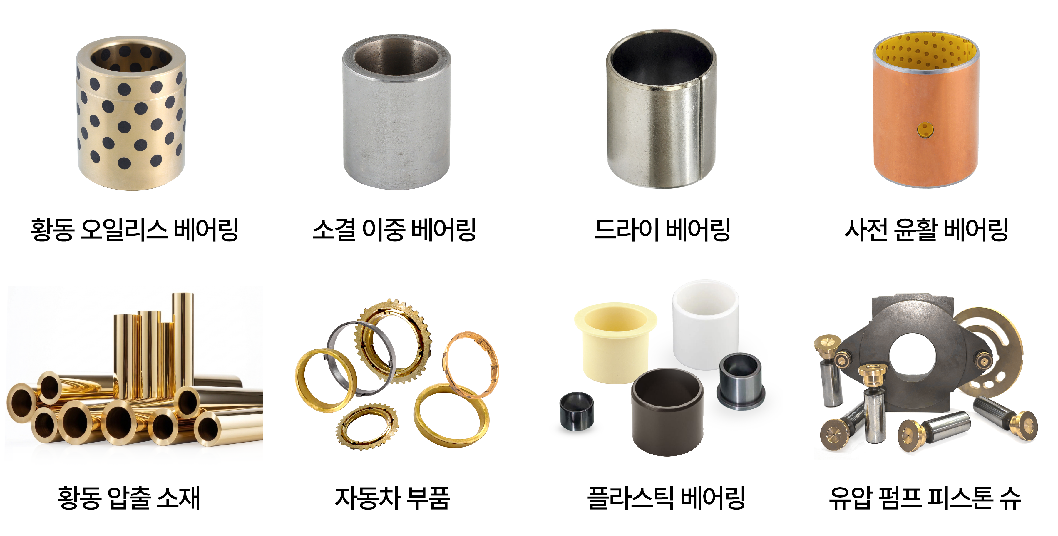 주요 전시 품목으로는 사출기, 프레스, 금형, 발전소 설비 등에 적용되는 황동 오일리스 베어링을 비롯해, 내구성과 윤활 성능을 동시에 갖춘 소결 이중 베어링, 그리고 자동차 부품 및 유압 펌프의 피스톤 슈 등에 활용되는 황동 압출 소재 등이 있으며, 실제 산업 현장에서 요구되는 다양한 조건에 대응할 수 있는 제품들을 직접 확인하실 수 있습니다.
