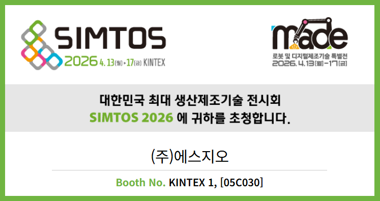 에스지오가 오는4월 13일부터 17일까지 대한민국 최대 생산제조기술 전시회인 SIMTOS 2026에 참가합니다.